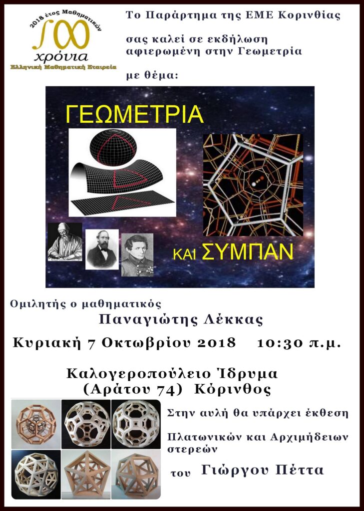 Το Παράρτημα Κορινθίας της ΕΜΕ στα πλαίσια του «2018 Έτος Μαθηματικών», καθώς και των 100 χρόνων από την δημιουργία της Ελληνικής Μαθηματικής Εταιρείας διοργανώνει εκδήλωση αφιερωμένη στη Γεωμετρία.
