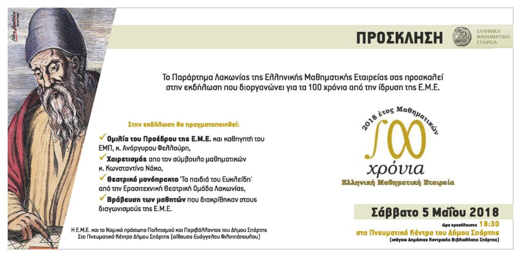 Το Παράρτημα Λακωνίας διοργανώνει στο πλαίσιο του εορτασμού των 100 χρόνων από την ίδρυση της ΕΜΕ τελετή βράβευσης για τους μαθητές του νομού που διακρίθηκαν στους διαγωνισμούς  της Εταιρείας.