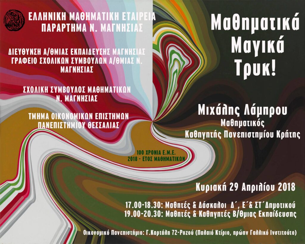 Η Ελληνική Μαθηματική Εταιρεία-Παράρτημα Ν. Μαγνησίας- στα πλαίσια των επιμορφωτικών της δράσεων και με αφορμή το «2018_Έτος Μαθηματικών – 100 Χρόνια Ε.Μ.Ε.» προγραμματίζει την διοργάνωση Εργαστηρίου-Workshop με θέμα: «Μαθηματικά Μαγικά Τρικ» με εισηγητή τον κ. Μιχάλη Λάμπρου, Καθηγητή Μαθηματικών του Πανεπιστημίου Κρήτης.