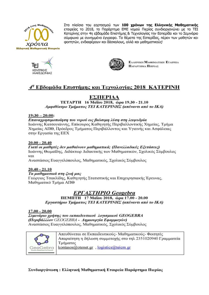 Στα πλαίσια του εορτασμού των 100 χρόνων της Ελληνικής Μαθηματικής εταιρείας το 2018, το Παράρτημα ΕΜΕ νομού Πιερίας συνδιοργανώνει με το ΤΕΙ Κατερίνης στην 4η εβδομάδα Επιστήμης & Τεχνολογίας την Εσπερίδα και το Σεμινάριο σύμφωνα με συνημμένο έγγραφο. Τα θέματα της Εσπερίδας, πέραν των μαθητών και φοιτητών, ενδιαφέρουν και δάσκαλους, αλλά και μαθηματικούς! Η παρουσία όλων μας κρίνεται απαραίτητη!