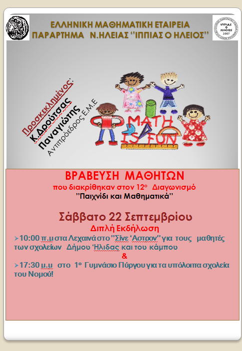 Παράρτημα Ν. Ηλείας: Βράβευση Μαθητών 12 Διαγωνισμού “Παιχνίδι και Μαθηματικά”